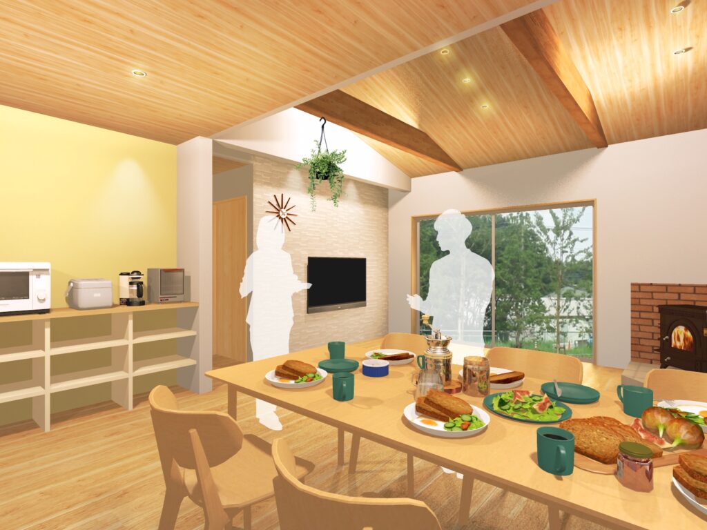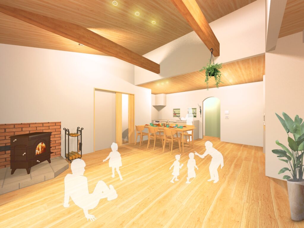 薪ストーブのやわらかな輻射熱が家全体を包み込み、炎を眺めながら家族が自然と集まる、